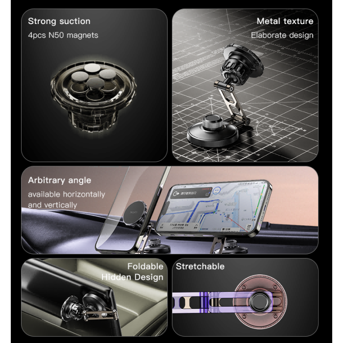 يتميز الحامل بمغناطيس قوي يساعد في تثبيت الهاتف بشكل ثابت وآمن أثناء القيادة. 🧲