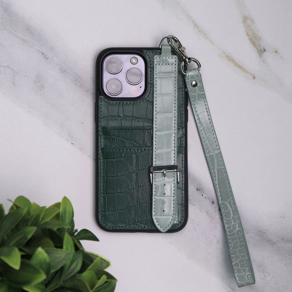 Dana Green Leather Case with Card Slot and Strap - كفر مع مسكة شريطة ومكان للبطاقات وخيط علاقة