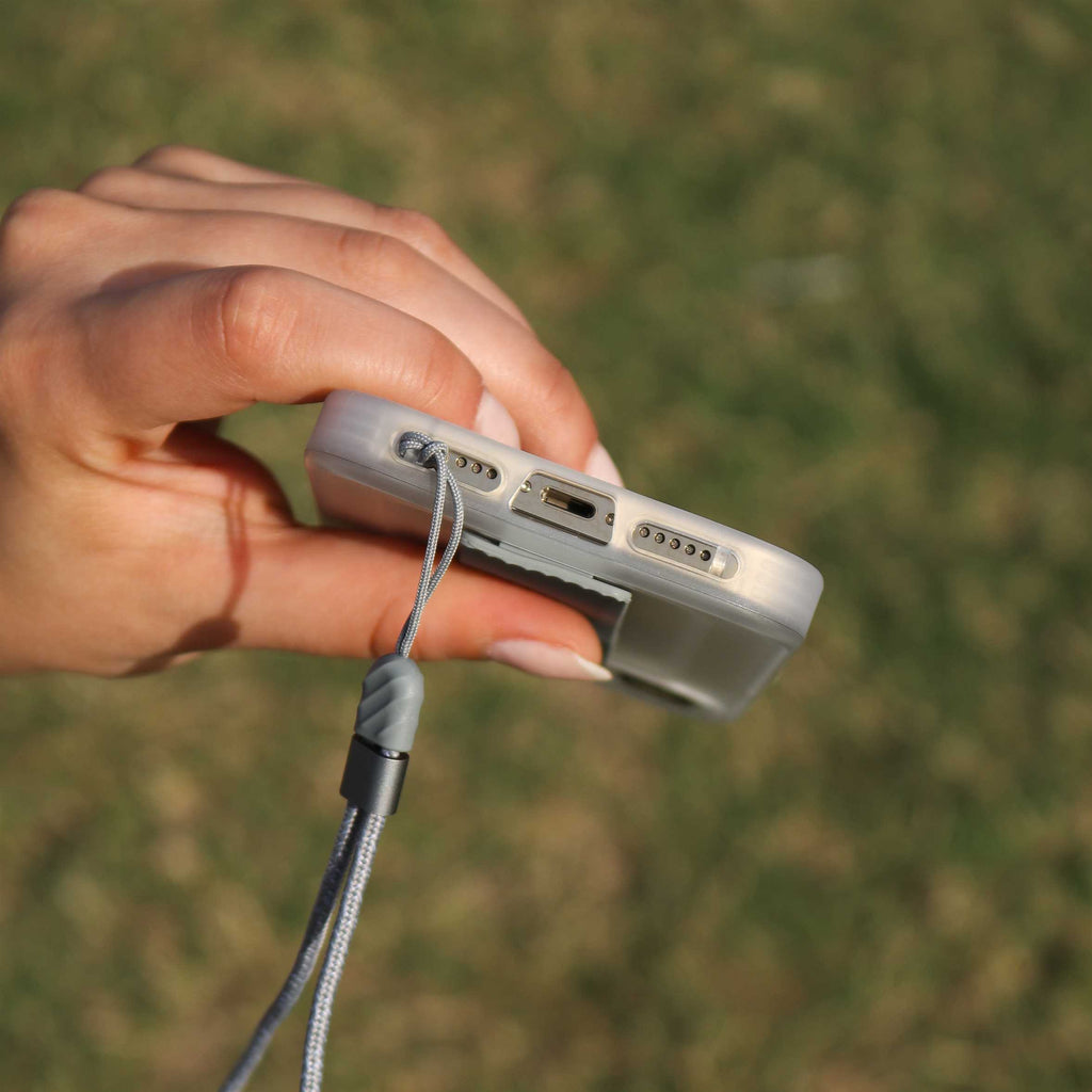 وكذلك يحتوي على خيط علاقة، يتقصر ويتطول على مقاس اليد، بحالة لو لاسمح الله بيطيح منكم التلفون. تقدرون تقصرونه على حجم معصم اليد، عشان مايزلق منكم التلفون ويطيح منكم