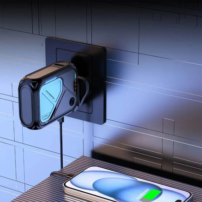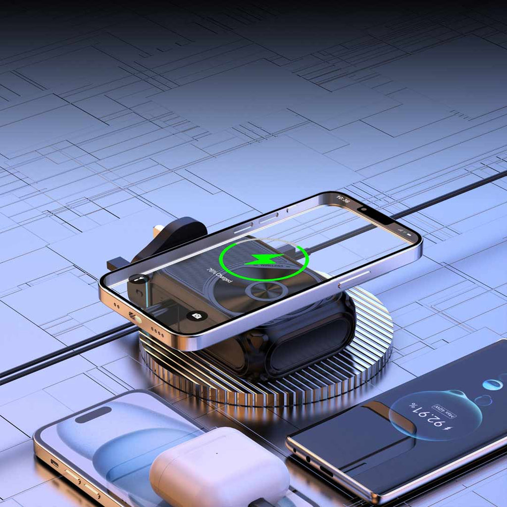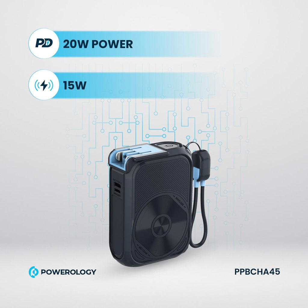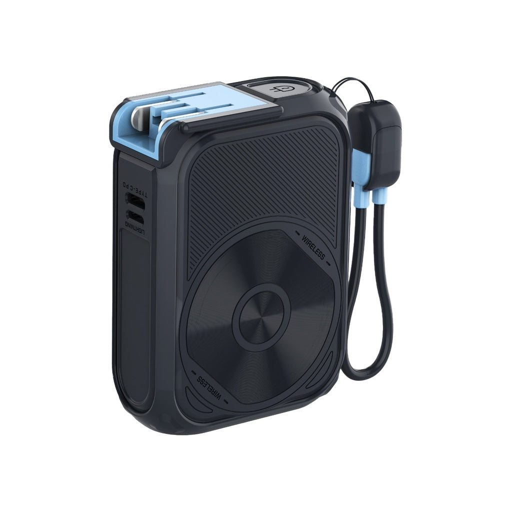 • شاحن مدمج: يحتوي على قابس مدمج (UK Plug) لشحن الباور بانك مباشرة من المقبس الكهربائي، مما يلغي الحاجة إلى حمل شاحن منفصل.