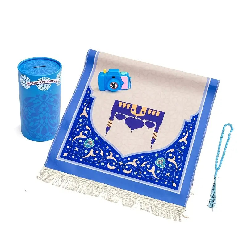Prayer Mat for Kids Prayer Islamic Rug Gift Set - Blue - طقم هدايا سجادة صلاة إسلامية ومسبحه وكاميرا بها صور اسلاميه للأطفال