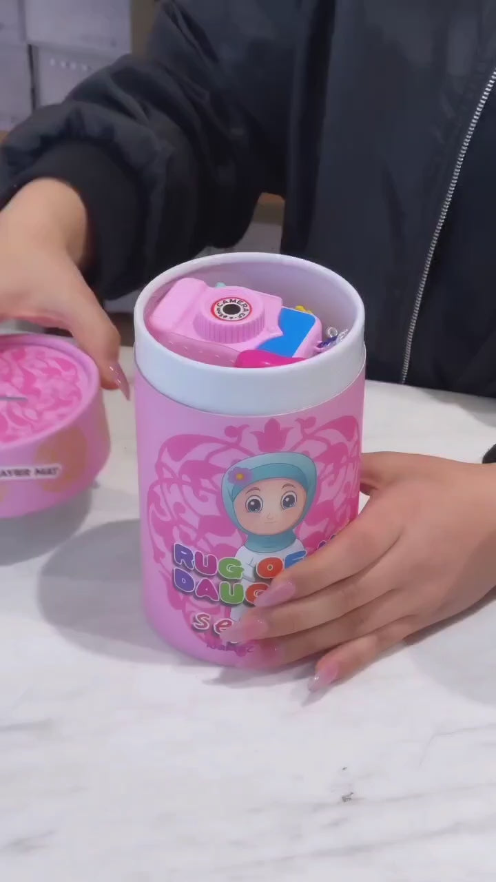 الطقم هذا مو بس يتكون من سجادة صلاة جميلة بألوان وتصميمات جذابة، بعد يتضمن مسبحة للأطفال تساعدهم على تعلم التسبيح وذكر الله بكل سهولة. 💖