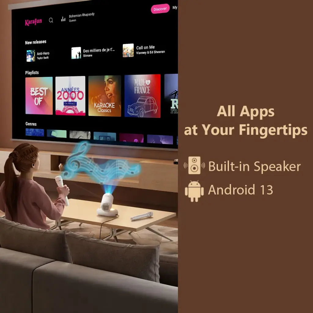 • تخيلي شاشة سينما تبدأ من 30 بوصة وتوصل لي 200 بوصة! 🍿 حولي أي حيطة بيضاء عندچ لسينما خاصة، شوفي الأفلام كأنچ داخل الحدث.