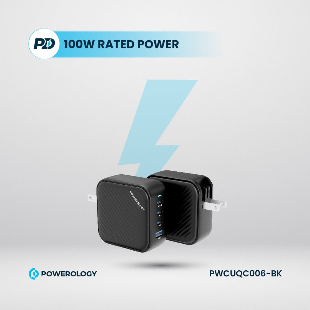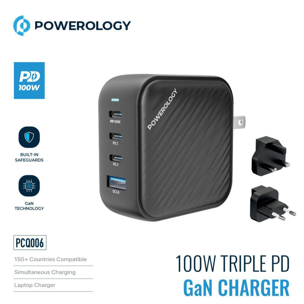 Powerology 100W Triple PD + 1 QC3.0 World Travel Kit - بلاك حائط شحن دولي - 4 فتحات للشحن - 3 فتحات تايب سي +1 فتحة يو اس بي - قوة 100 واط - كفالة 24 شهر