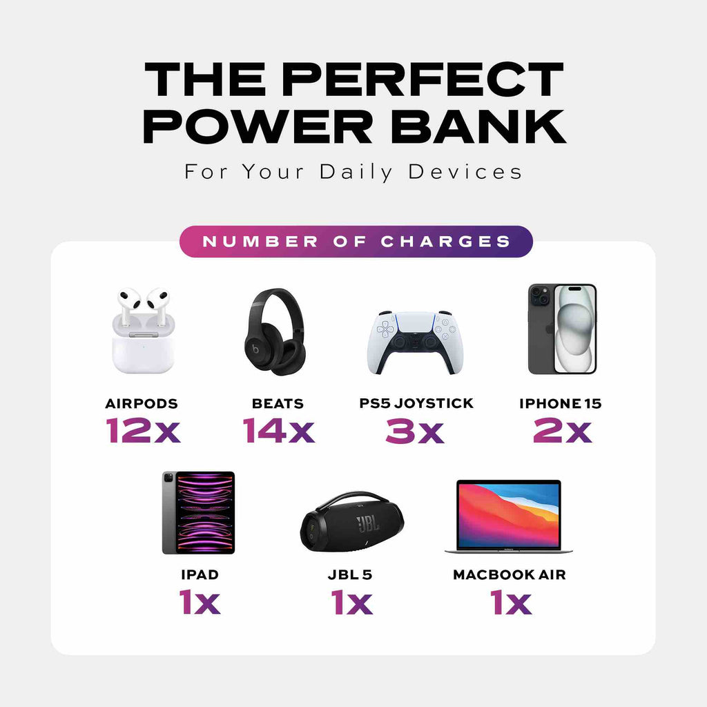 باور بانك قوي: شاحن مو بس للشبك، بعد يحتوي على باور بانك عشان تشحنين جهازك في أي مكان بدون ما تحتاجين كهرباء. يعني لو كنتِ برة البيت أو في السفر، جهازك دايمًا بيظل مشحون. 💪🔋