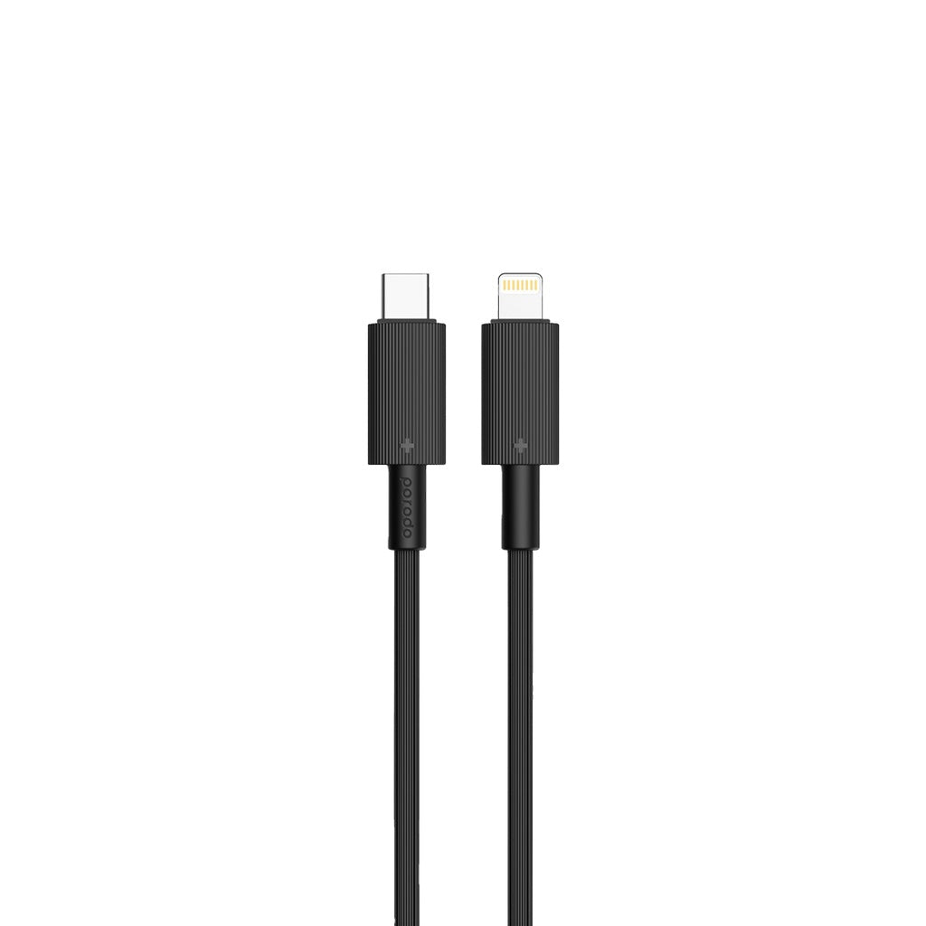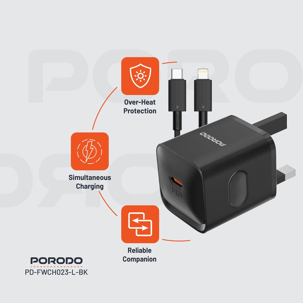 Porodo USB-C Power Delivery Wall Charger with Lightning Cable - Black - بلاك شاحن حائط + سلك شحن ايفون - تايب سي - بورودو - كفالة 12 شهر