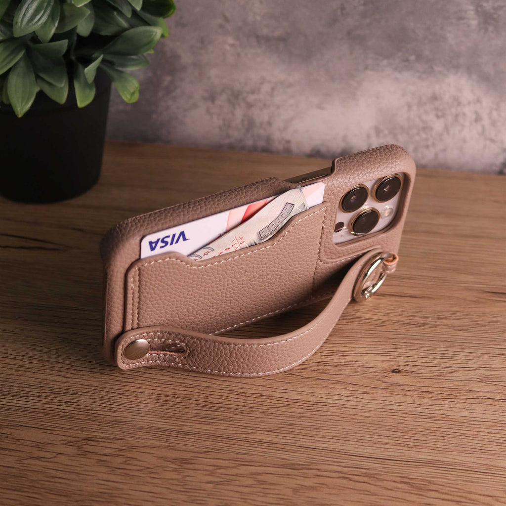 Leather Case with Card Slot and Wrist Strap - Beige - كفر مع محفظة للبطاقات ومسكة شريطة وستاند