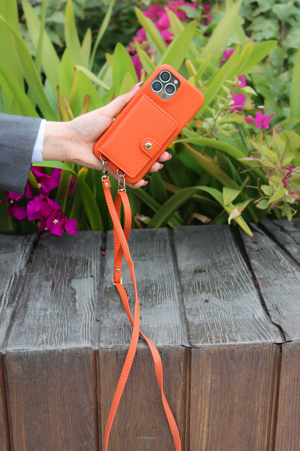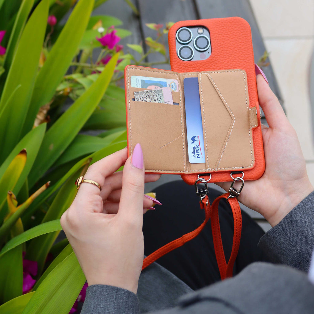 Orange Case with Card Wallet and Strap Lanyard - كفر جلد مع محفظة للبطاقات وخيط علاقة
