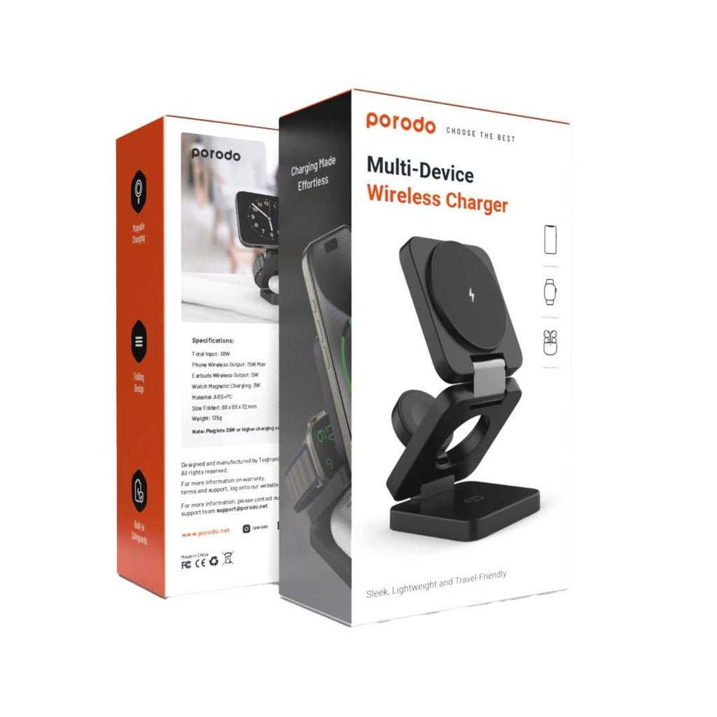 Porodo Multi-Device Wireless Charger Sleek, Lightweight And Travel -Friendly - Black - ستاند شحن - 3 في 1 خاصية الشحن السريع - شحن الايفون + الساعة + السماعة - كفالة 24 شهر